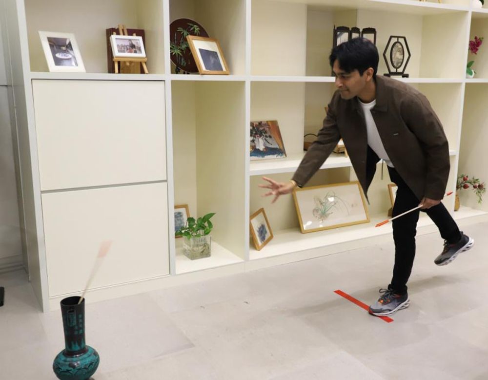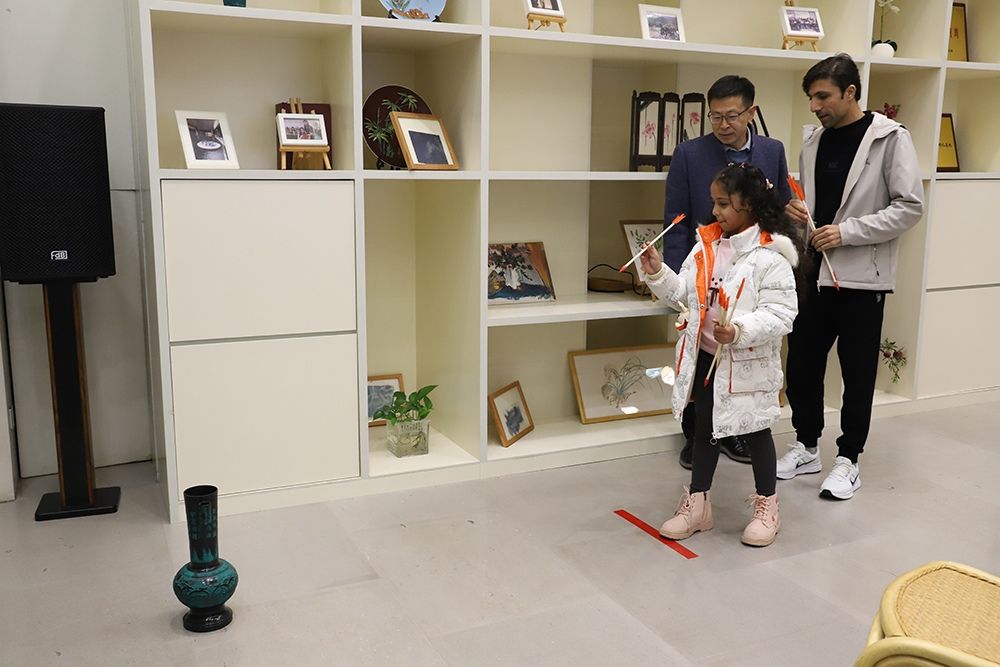另一侧的投壶游戏区则人气颇高,成为全场互动最热烈的环节之一。教师们手持木箭,专注投向壶中。每当有人投中,现场便响起一片掌声与欢呼。不少教师表示,这个传统游戏既有趣又考验手感,“让人想起家乡的类似游戏,感觉很亲切”。